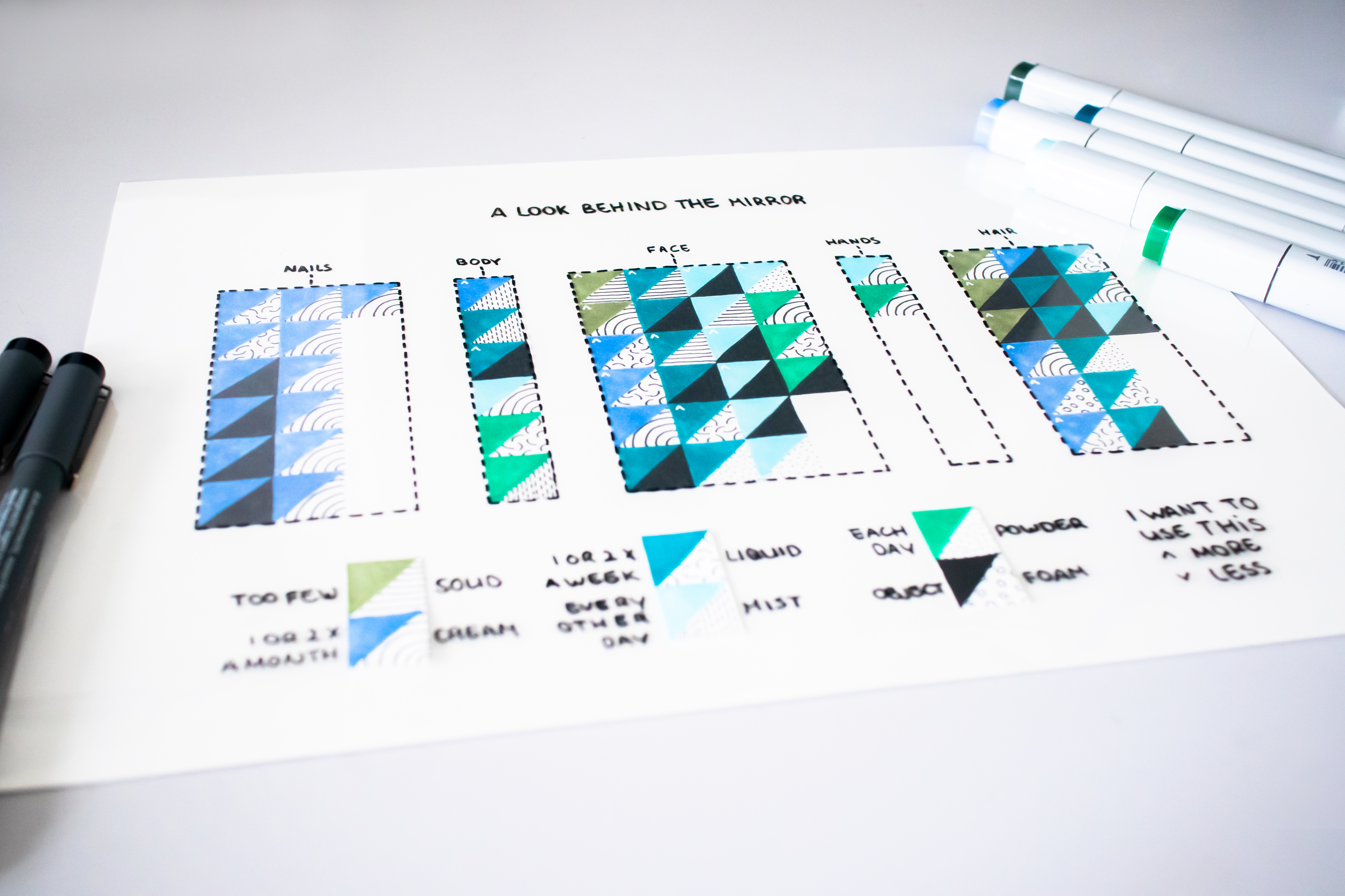 For this project, I opened up the drawer where all my care products live. From the toothpaste I use every day to the hair oil that’s been sitting there, almost forgotten. I mapped out the different substances, how often I use them, and which part of the body they’re meant for. The abstract image doesn’t just reveal my habits—it also shows the shifts I’d love to see in them.