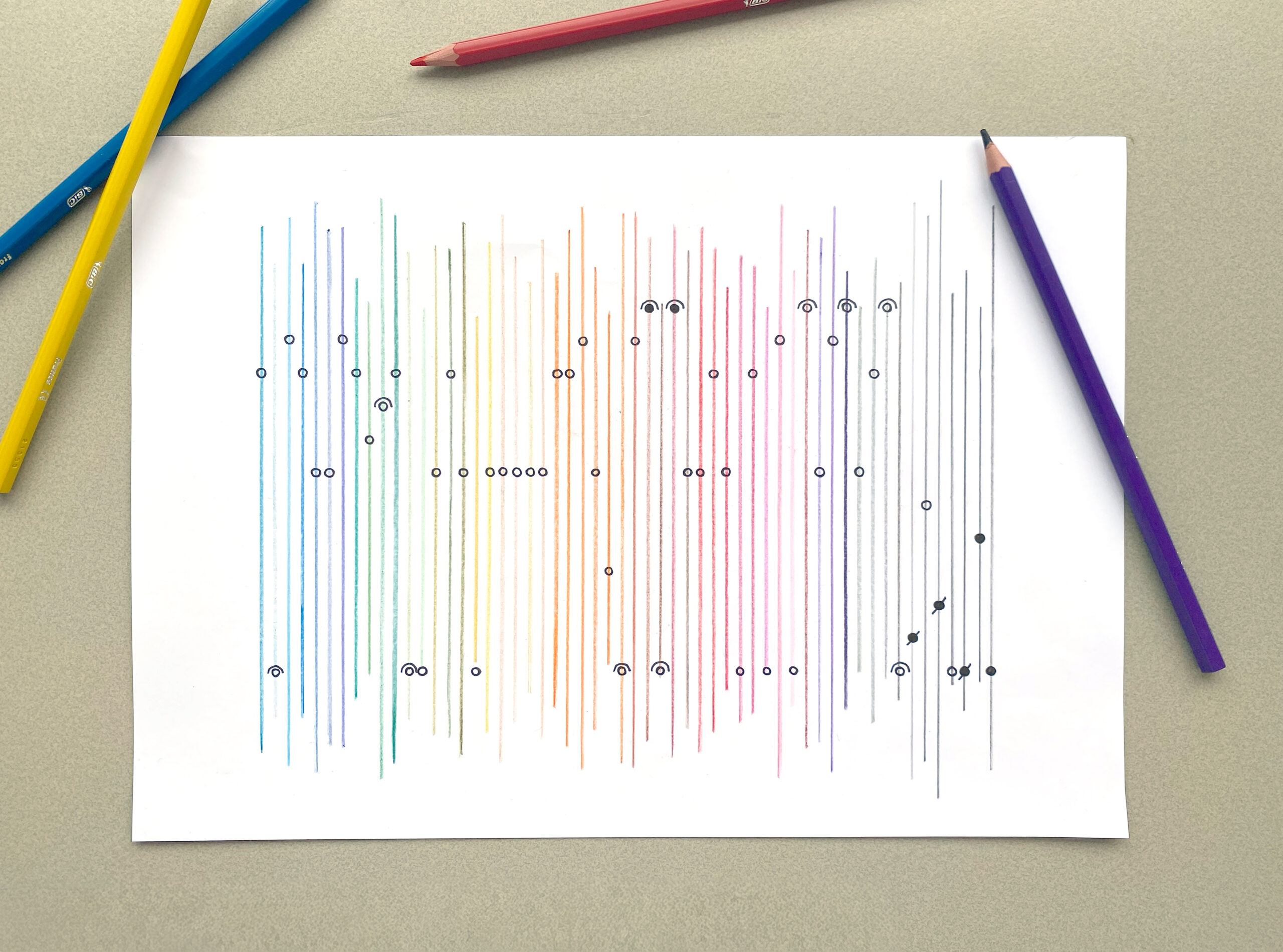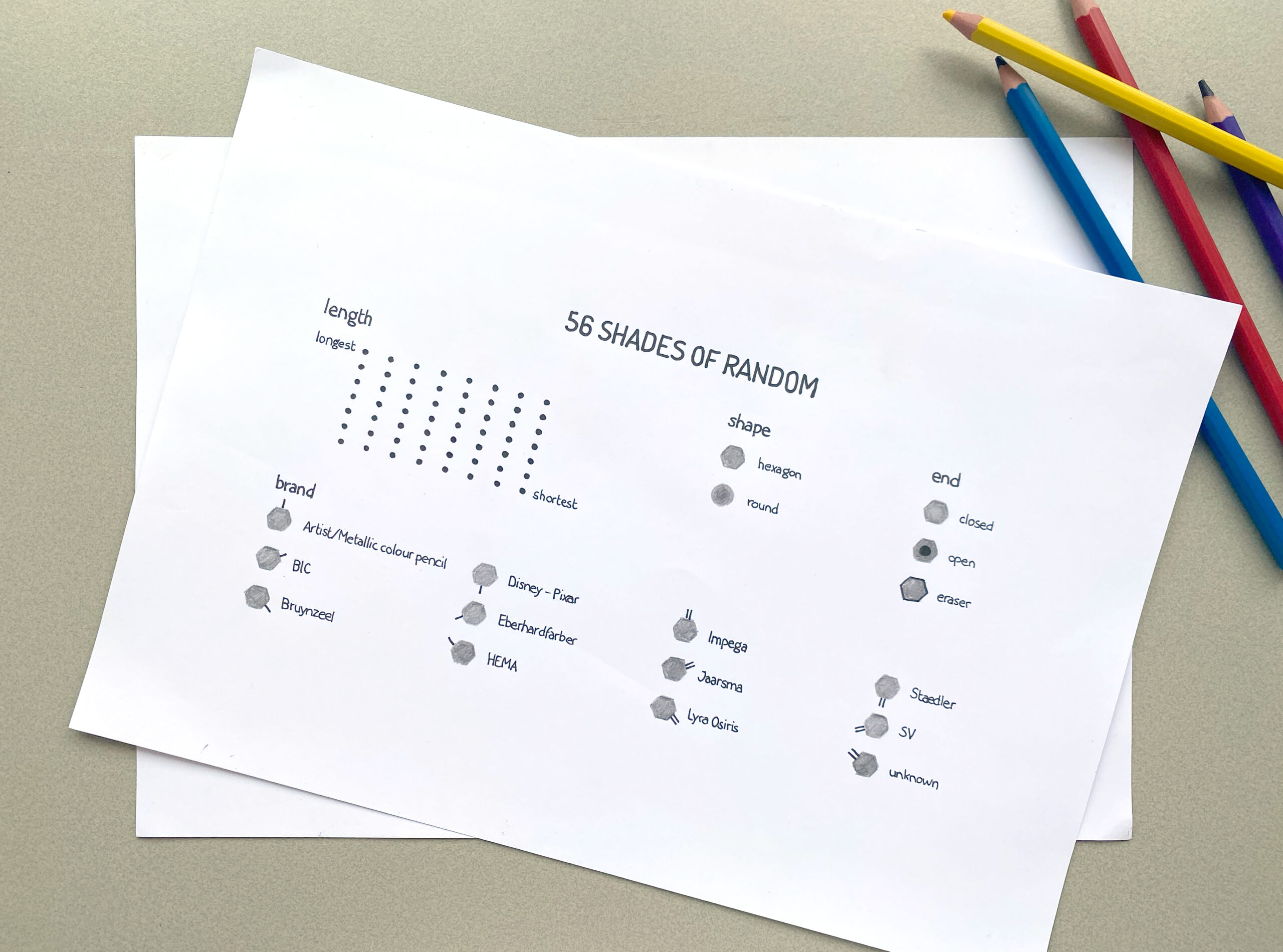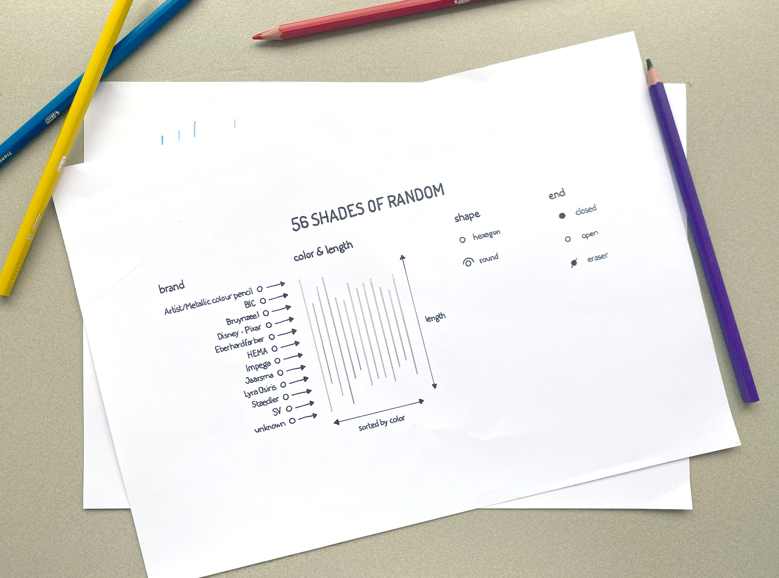 Het uitgangspunt was eenvoudig: twee handen vol potloden uit een bak. Van elk potlood bracht ik verschillende eigenschappen in kaart, zoals de intensiteit van het pigment en de vorm van de doorsnede. Deze gegevens vormden de basis voor een tweedelig werk waarin verschillende perspectieven op hetzelfde object zichtbaar worden.