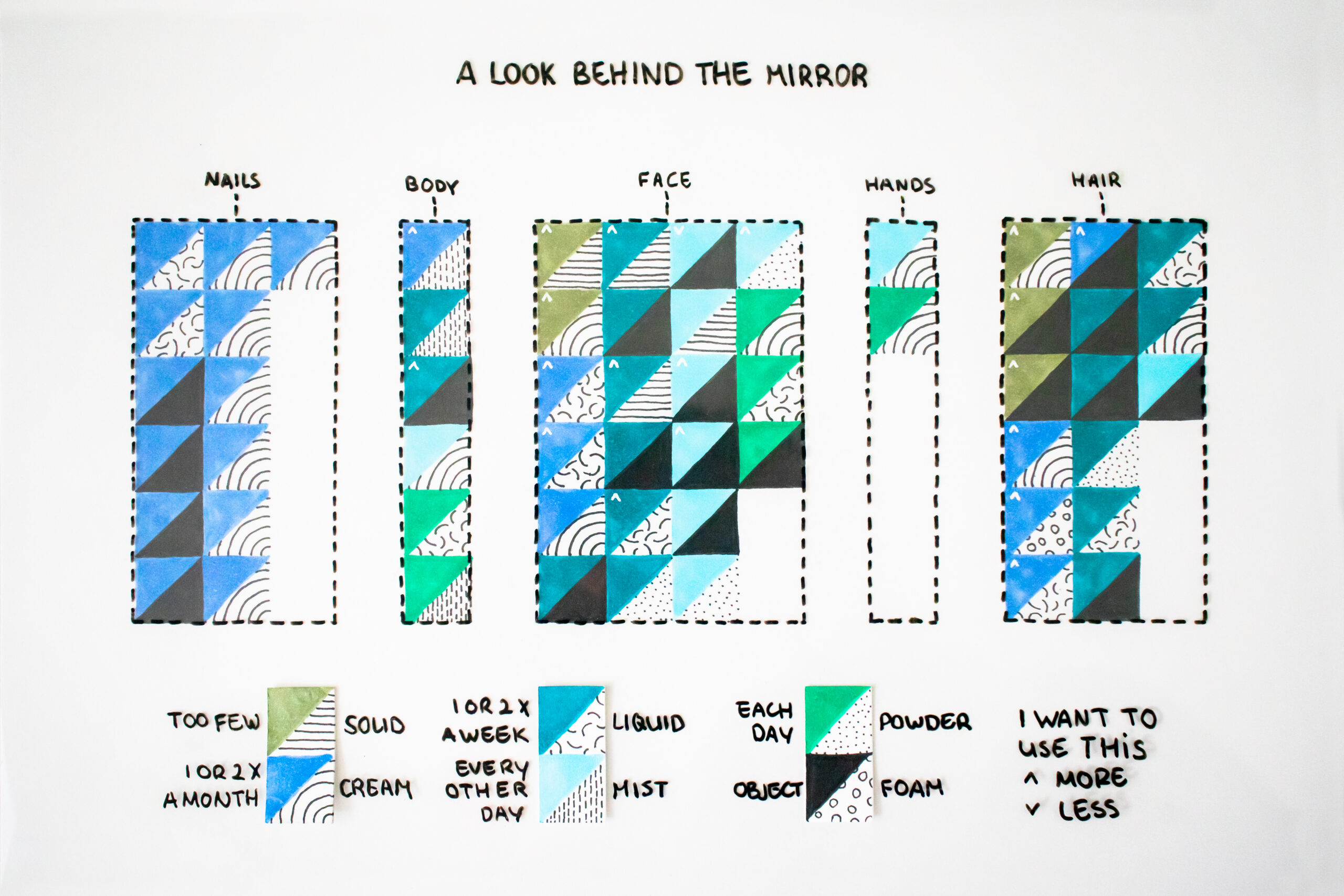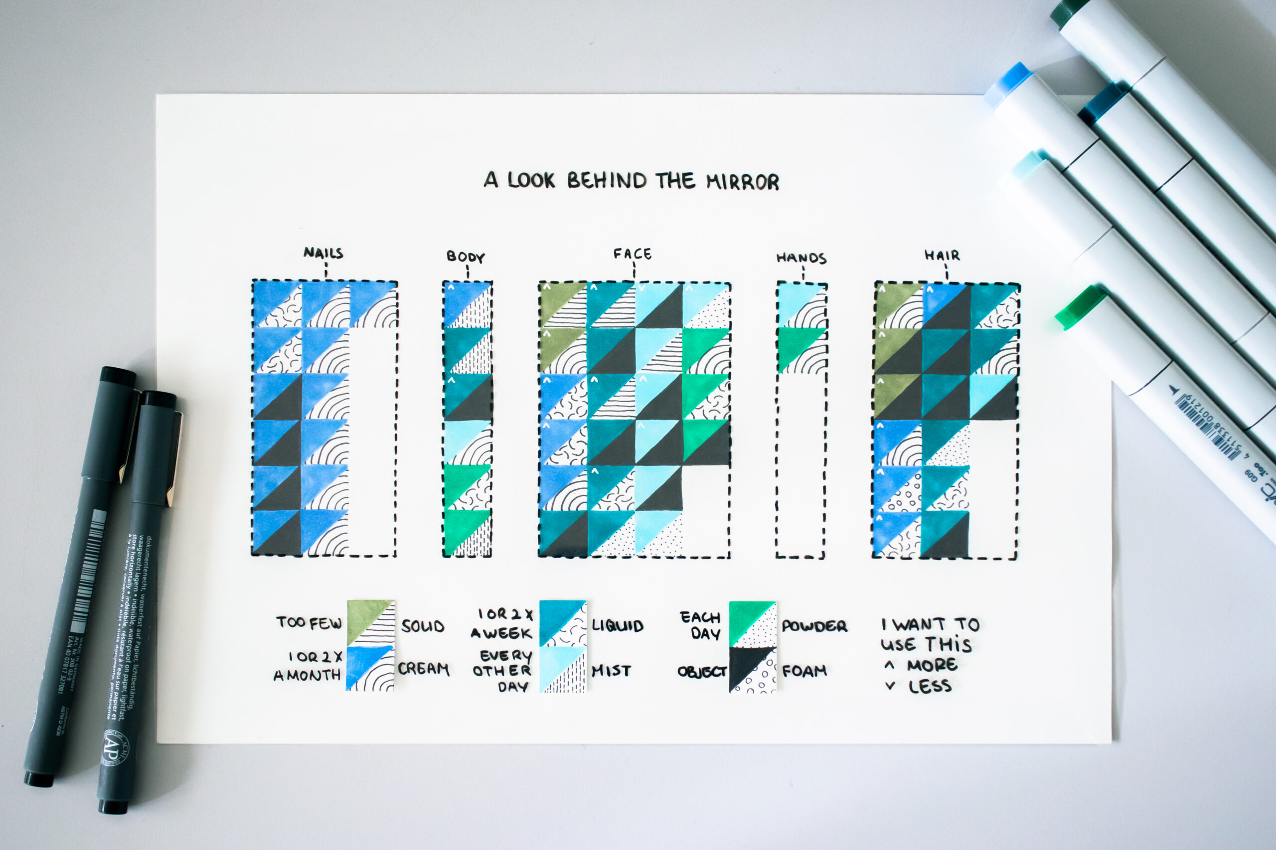 Ik bracht verschillende eigenschappen in kaart, zoals samenstelling, gebruiksfrequentie en het deel van het lichaam waarvoor ze bedoeld zijn. Door deze gegevens te visualiseren ontstond een abstract beeld dat niet alleen mijn gewoontes laat zien, maar ook de veranderingen die ik daarin zou willen maken.
