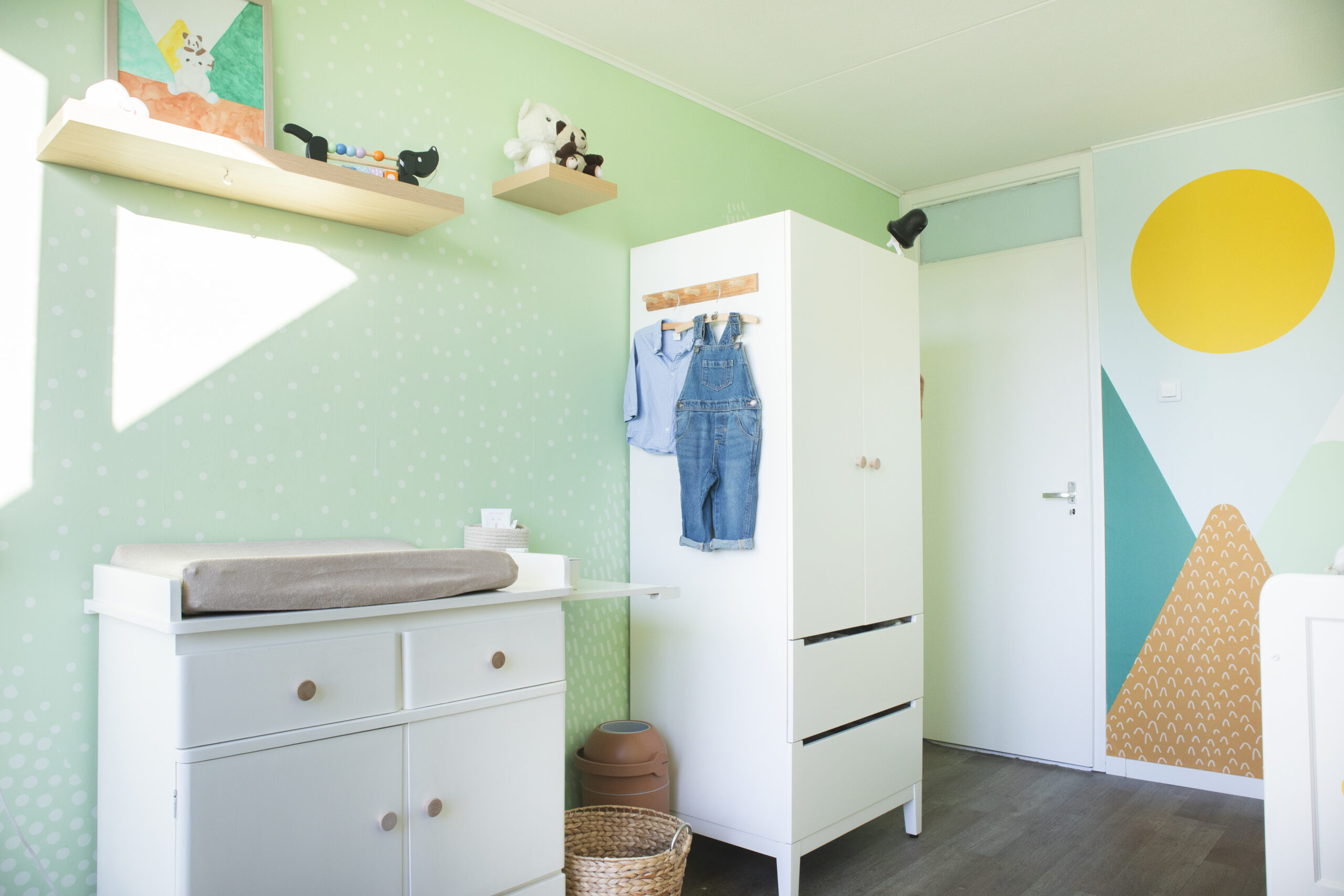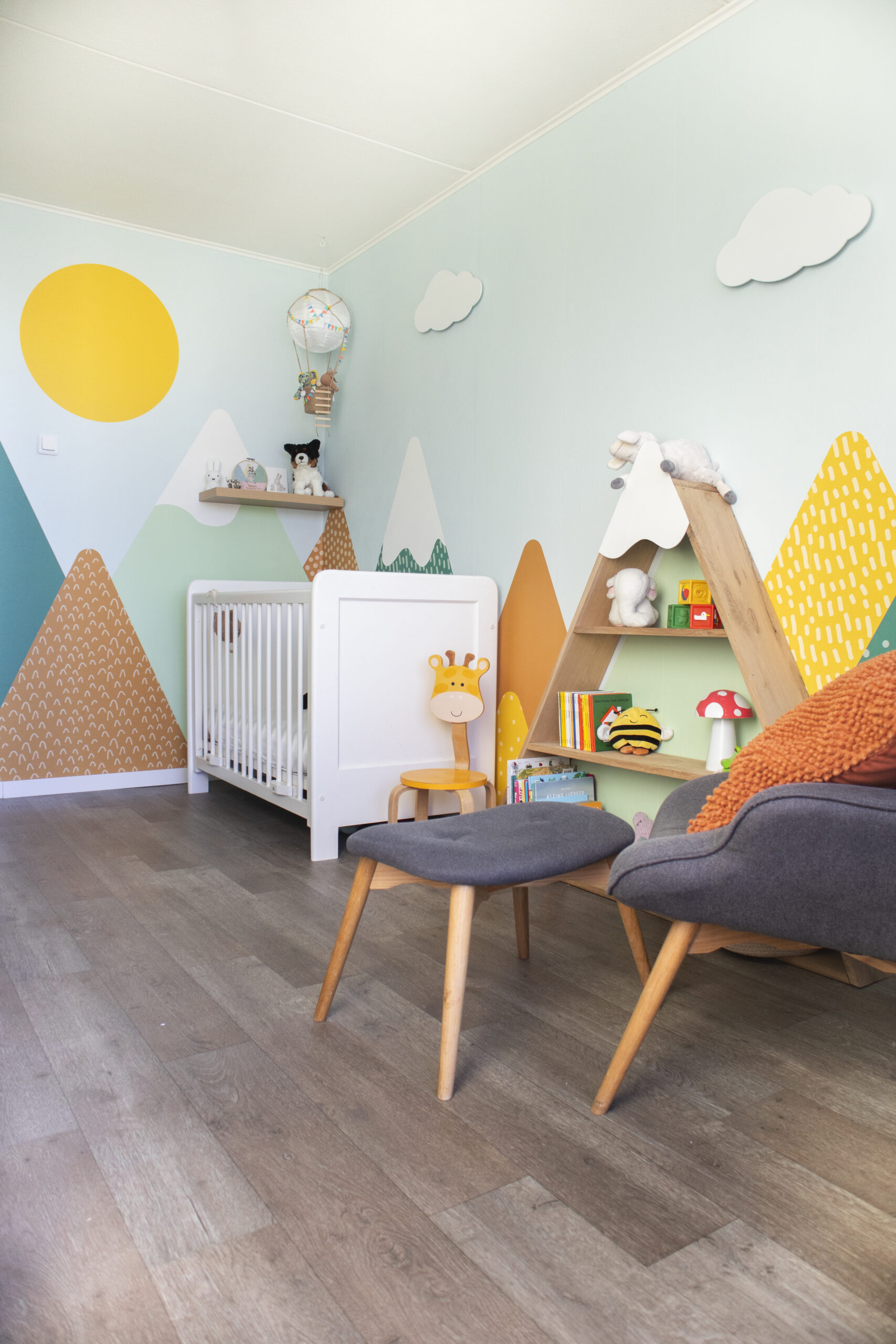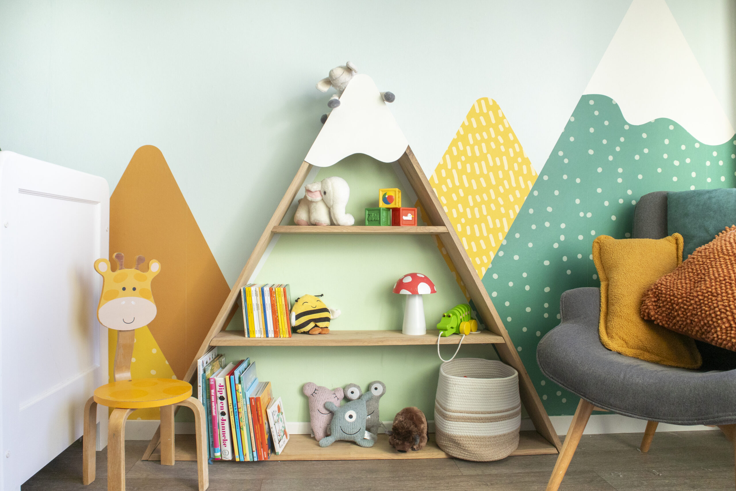 Growing Landscape — Mountains begon als een persoonlijk project voor mijn eerste zoon. Ik wilde zelf het behang voor zijn kamer ontwerpen, met bergen als thema. De stijl werd abstract, met frisse en knallende kleuren, maar met als doel een rustige en fijne ruimte om in op te groeien. Vanuit dat behang ontstond het idee om de vormentaal door te trekken in andere elementen in de kamer, zoals een boekenkast in bergvorm.