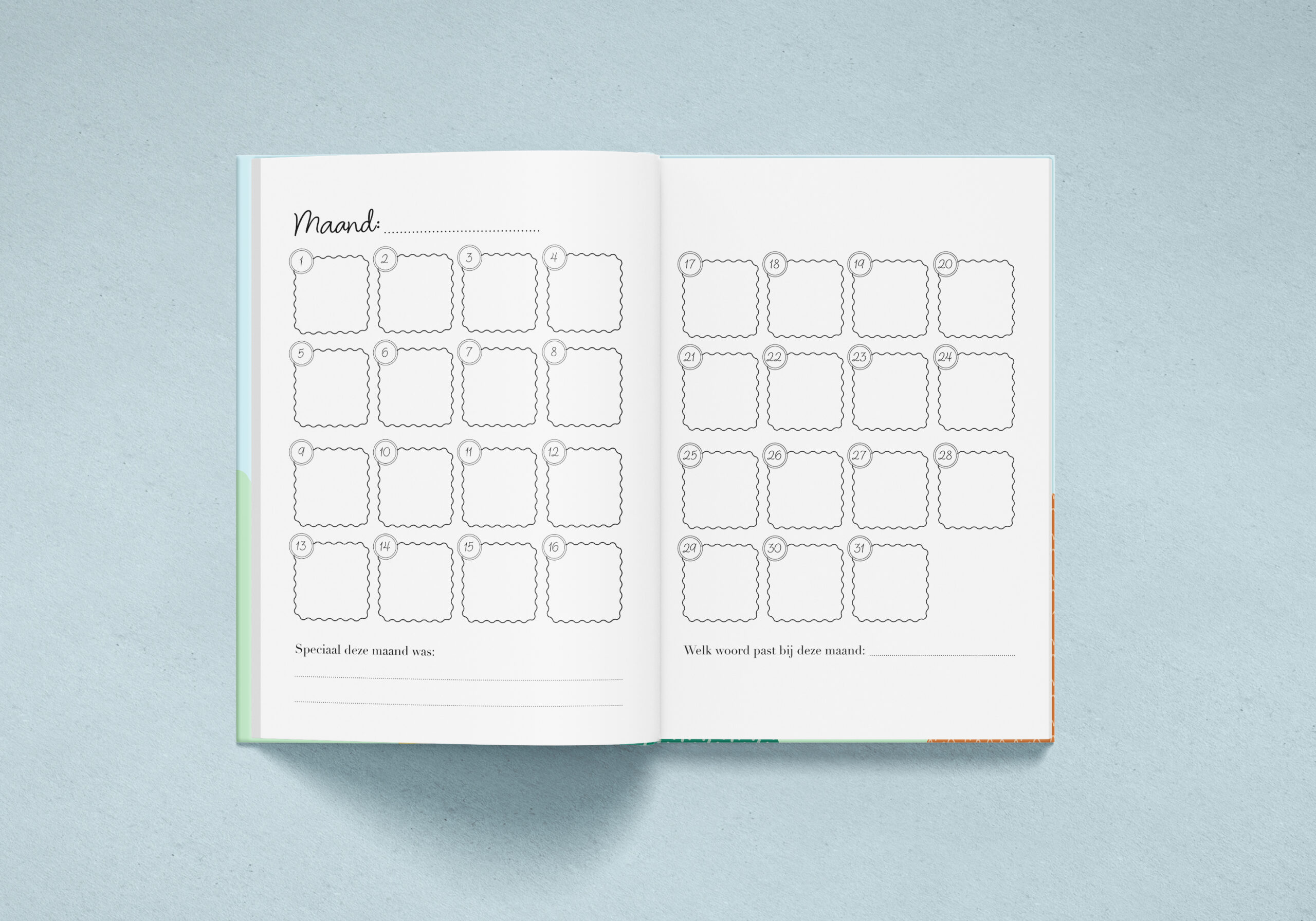 De maandoverzichten hebben de structuur van een agenda, maar geven ruimte om momenten vast te leggen op een manier die natuurlijk voelt. Niet elke dag hoeft beschreven te worden. Juist de bijzondere herinneringen, de eerste stapjes of die verwonderde blik wanneer er een vogel voorbij vliegt, krijgen hier een plek. In veel bestaande boeken miste ik die vrijheid; dit ontwerp biedt ruimte om vast te leggen wat voor jou betekenisvol is.